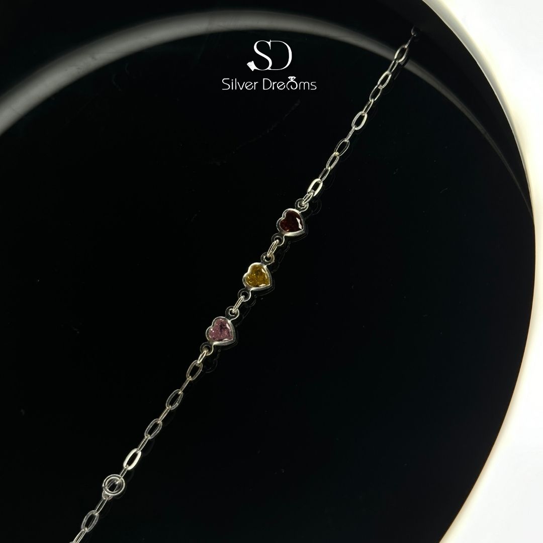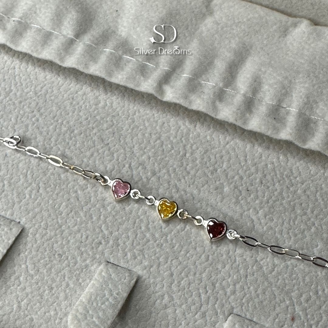 Pulseira Infantil 3 Corações Coloridos em Zircônia 2 mm em Prata 925