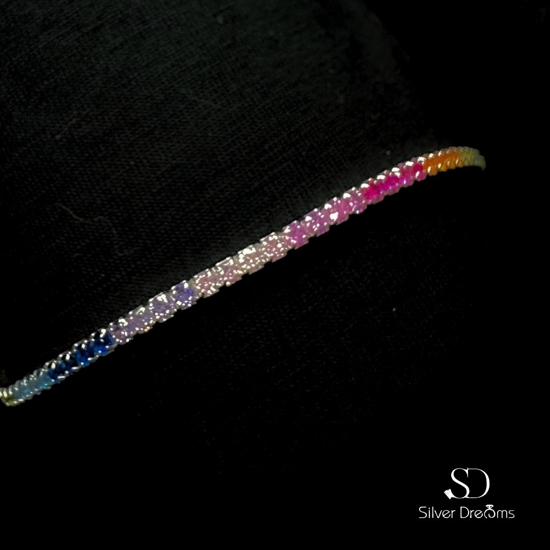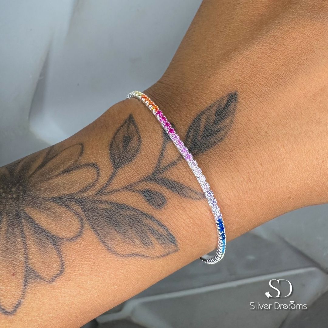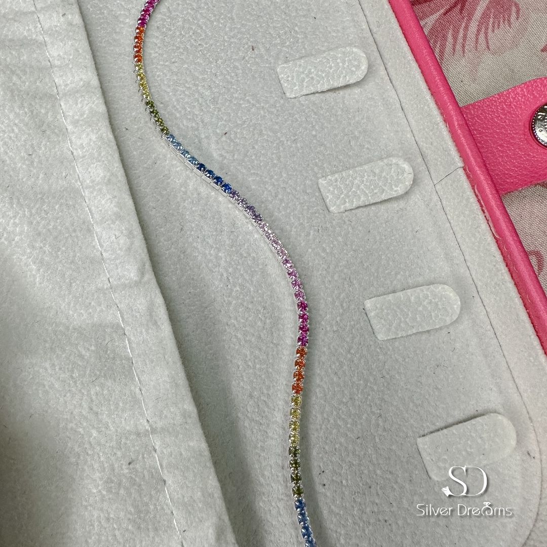 Desperte seu estilo com a Pulseira Riviera Colorida em Prata 925 da Silver Dreams. Com um deslumbrante conjunto de pedras coloridas dispostas em um design elegante, esta peça adiciona um toque vibrante e sofisticado ao seu visual. Feita em prata 925, oferece durabilidade e um brilho refinado. Perfeita para iluminar qualquer ocasião.